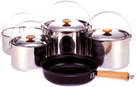アルミやステンレス製の軽量で、鍋・フライパンなどがセットされた携帯用炊事用具のこと。 最近はフッ素加工やホーロー製品も出回っているようです。ご予算に合わせてどうぞ。